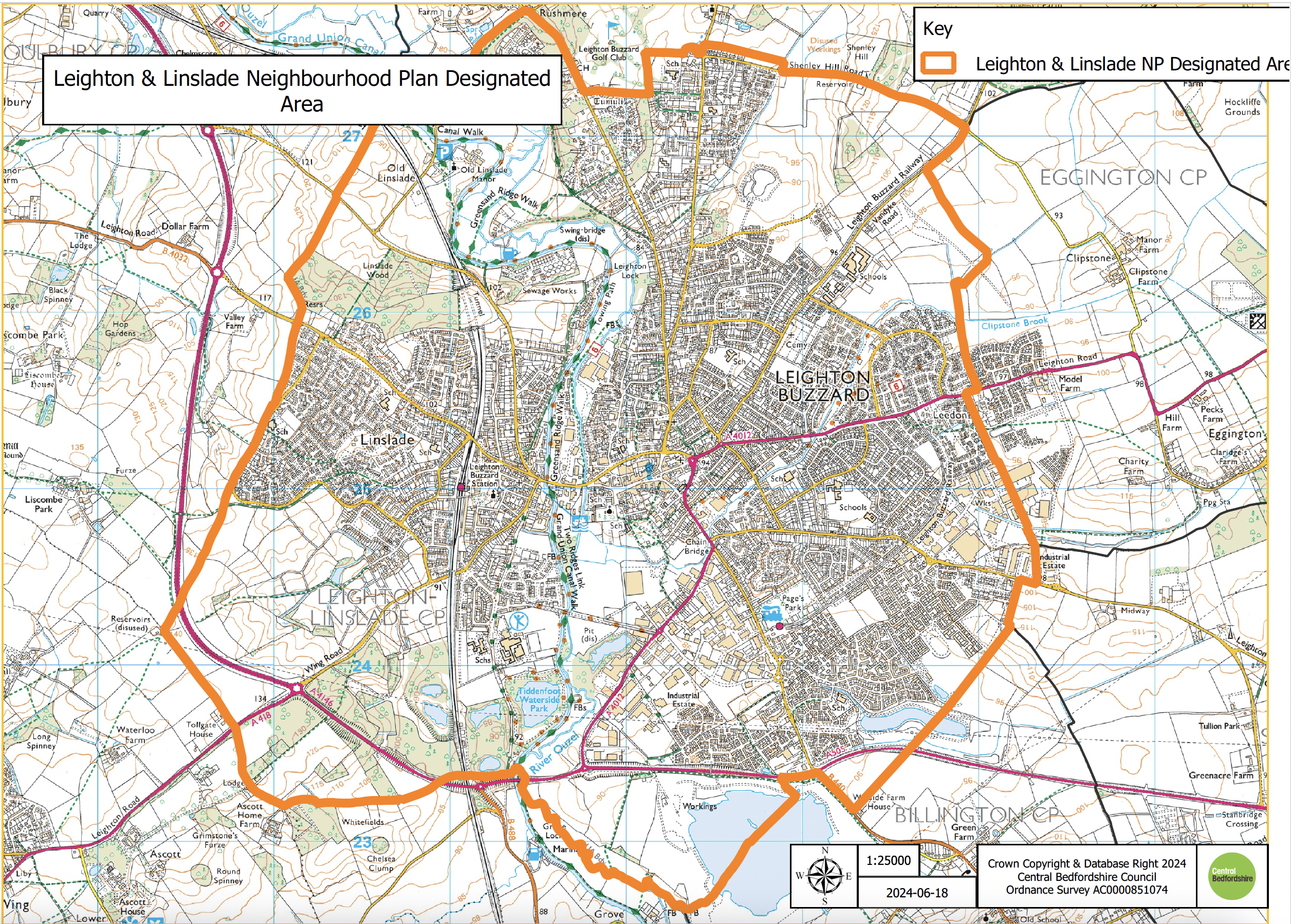 - The Leighton Linslade Neighbourhood Area was designated by Central Bedfordshire Council on the 26th June 2024 as the area to which the policies of the LLNP will apply. A map showing the Neighbourhood Area is shown below. The area coincides with the Town Boundary.